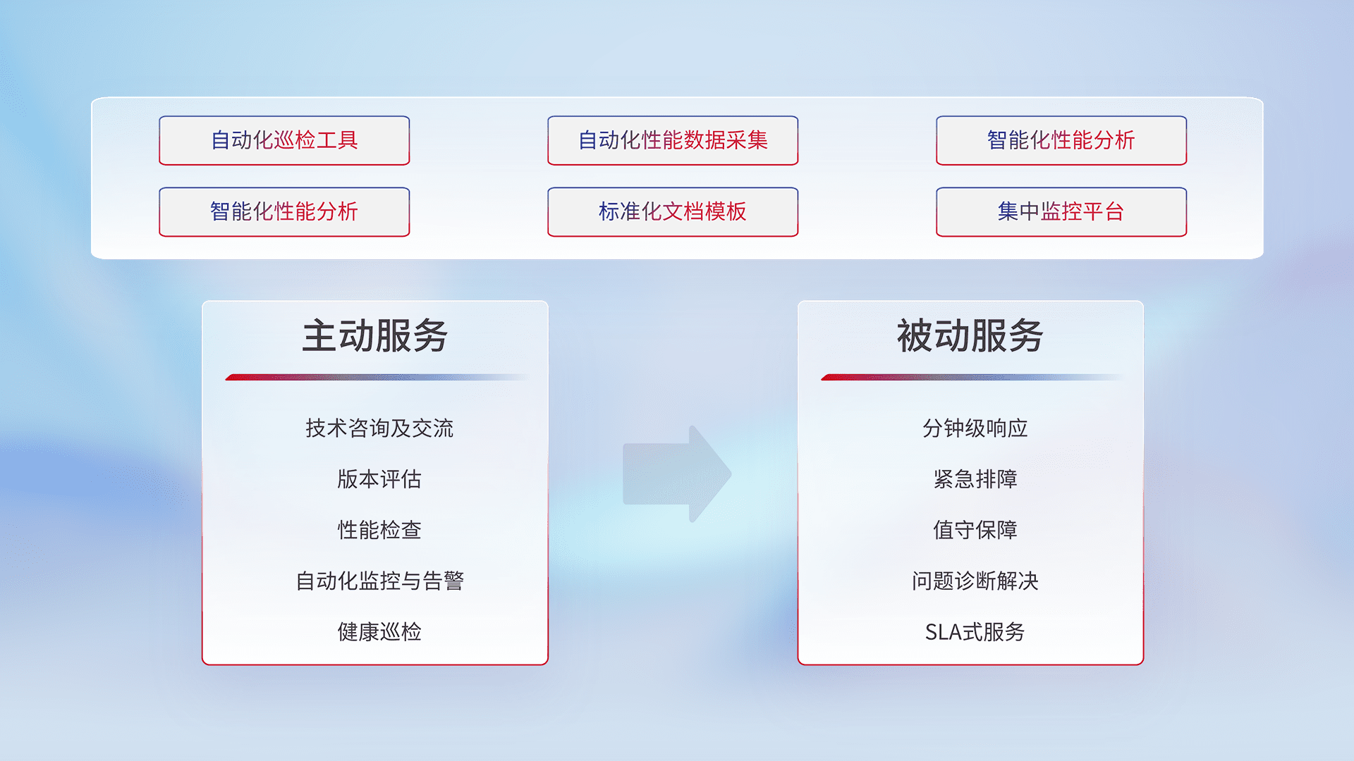 智能化工具和标准化文档,,,,保障服务质量,,,,提供主动服务(包含技术咨询、、、、版本评估、、、性能检查、、、自动化监控与告警、、、、健康巡检)和被动服务包含(分钟级响应、、、紧急排障、、、、值守保障、、、问题诊断解决、、、SLA服务)。。。。